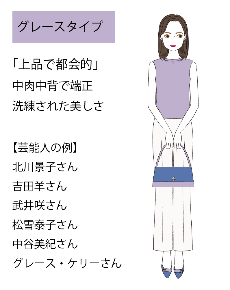 お一人お一人に似合う色があるように、お一人お一人に合った装いがあるのです。上記6種類8タイプの中から2つ導き出します。