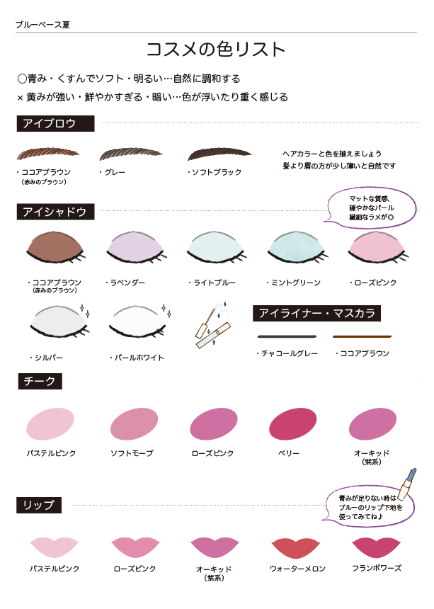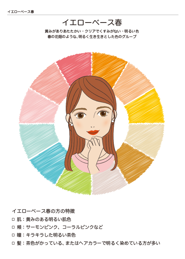 - イエローベース春 :イエローベース春の方の特徴・似合う色リスト・似合うコスメリスト・他の季節を付けるとどうなる?・おすすめ配色