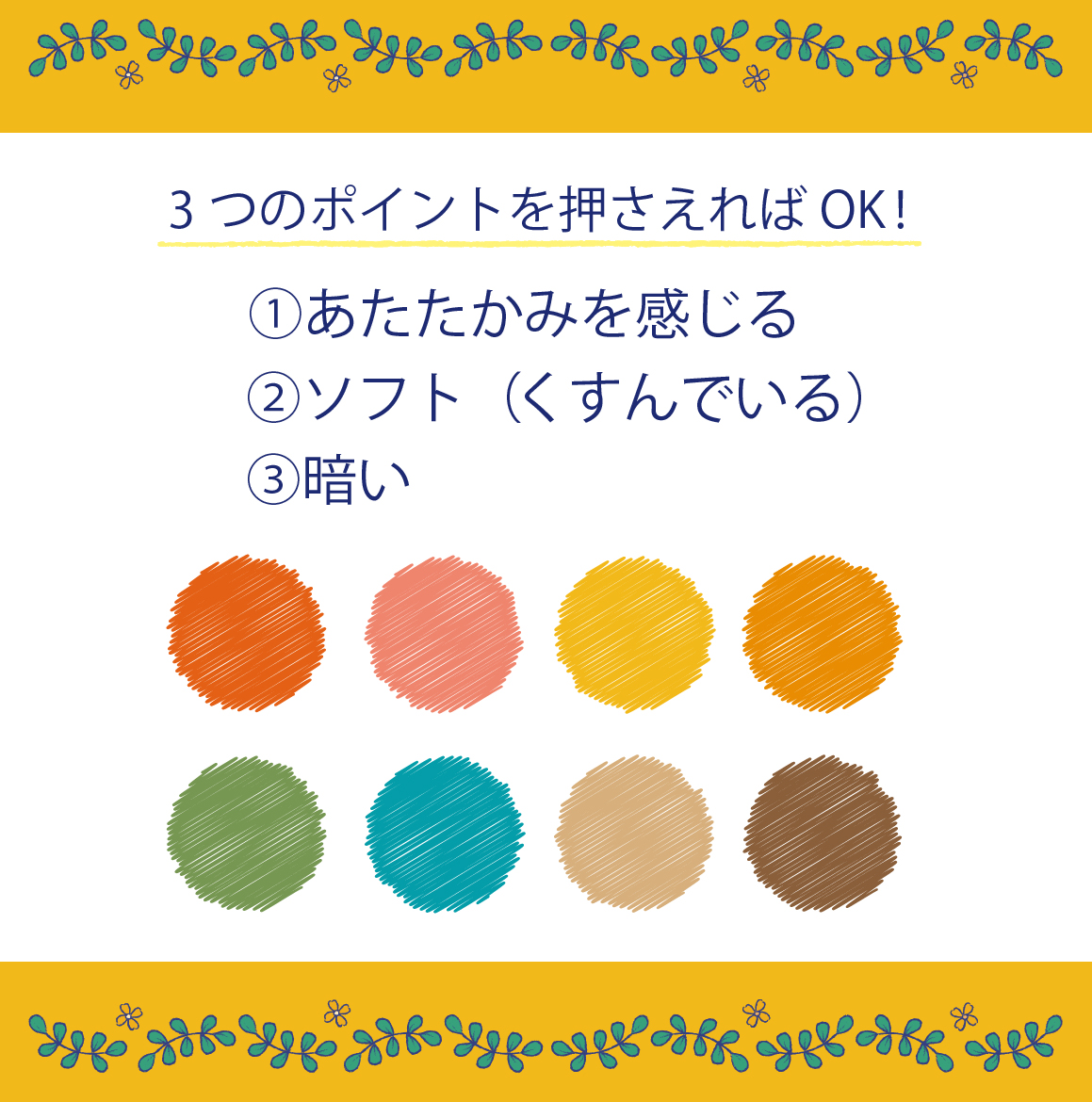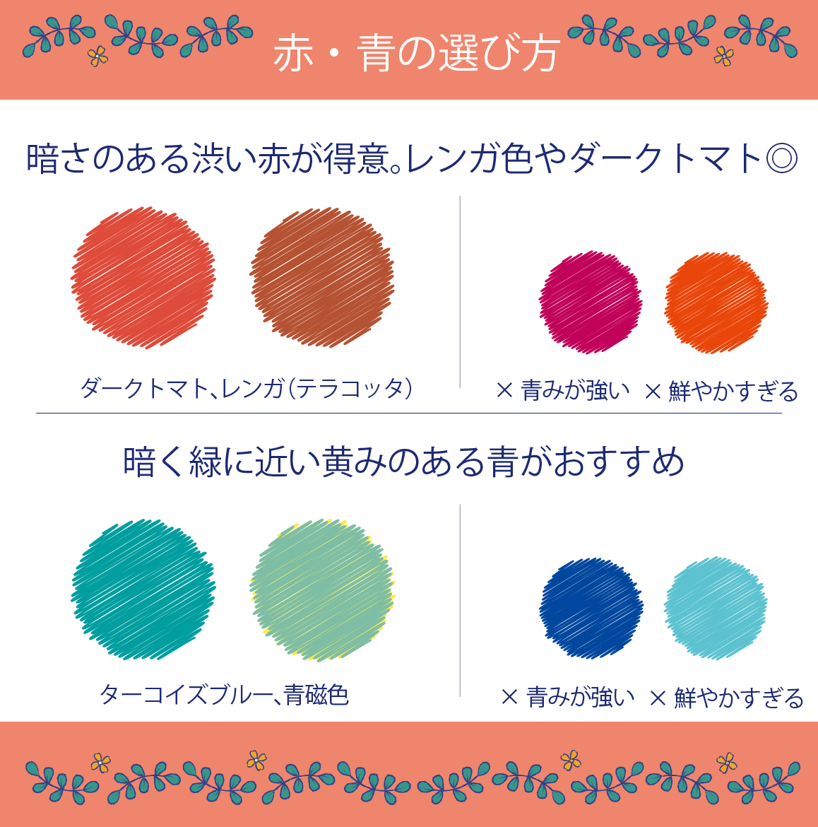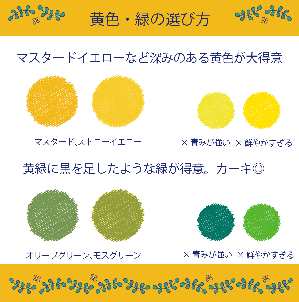 黄色と緑は大得意。マスタードやストロー(麦わら)のようなくすんだ黄色、緑は深みのあるオリーブグリーンやモスグリーンがすてきです。赤は深みのあるレンガやダークトマト。青は緑に近い濃いものや、青磁のようなくすんだ緑がおすすめです。