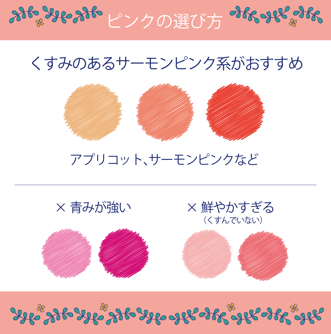 ピンクはあまり得意ではないので、オレンジに近いものがおすすめです。深みのあるサーモン、アプリコットなど。