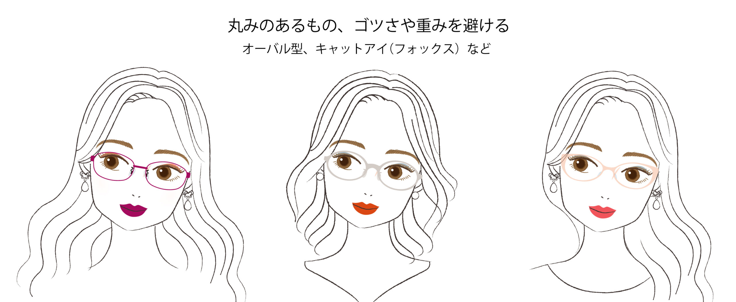 甘く華やかなロマンスタイプ。メガネは曲線的なものがおすすめです。オーバル、キャットアイなど。角ばったものや重い感じのものは避けましょう。