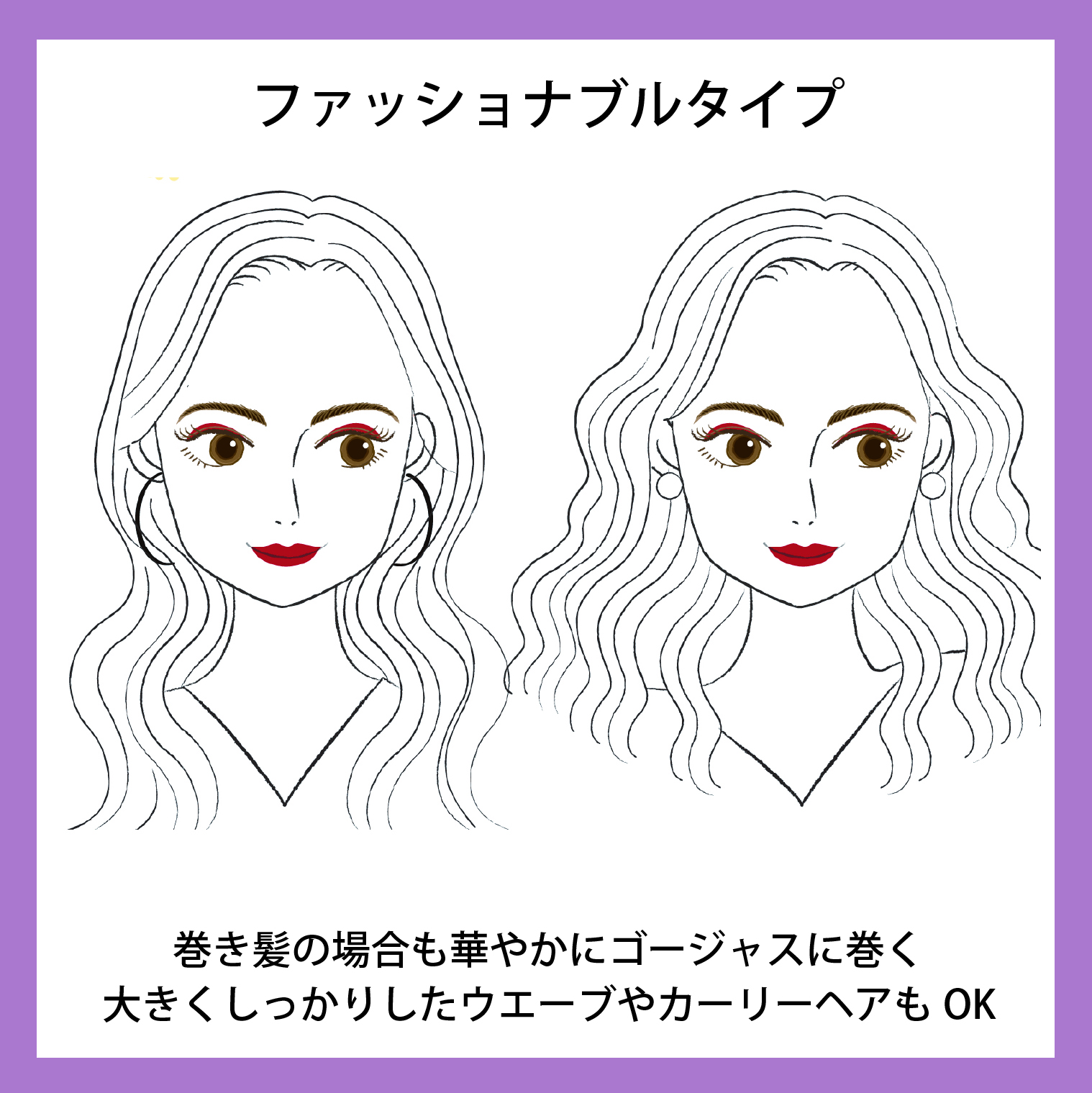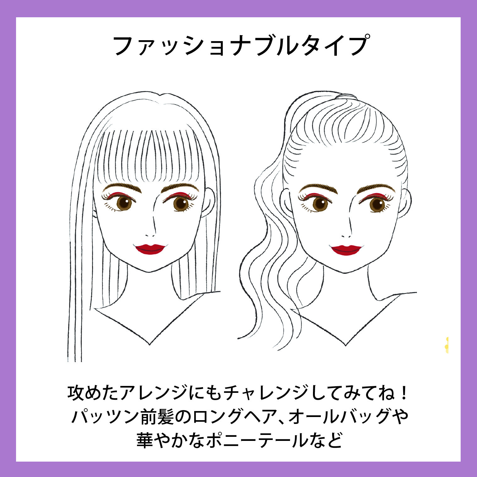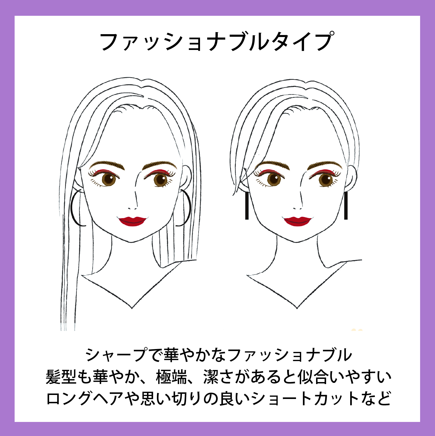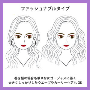 ファッショナブルタイプは極端さのある髪型、ストレートロングや思い切りのよいショートカットが得意です。ゴージャスな巻き髪もいいですね。お好きならモード系もいいですし、かっこよさのあるアレンジも得意です。