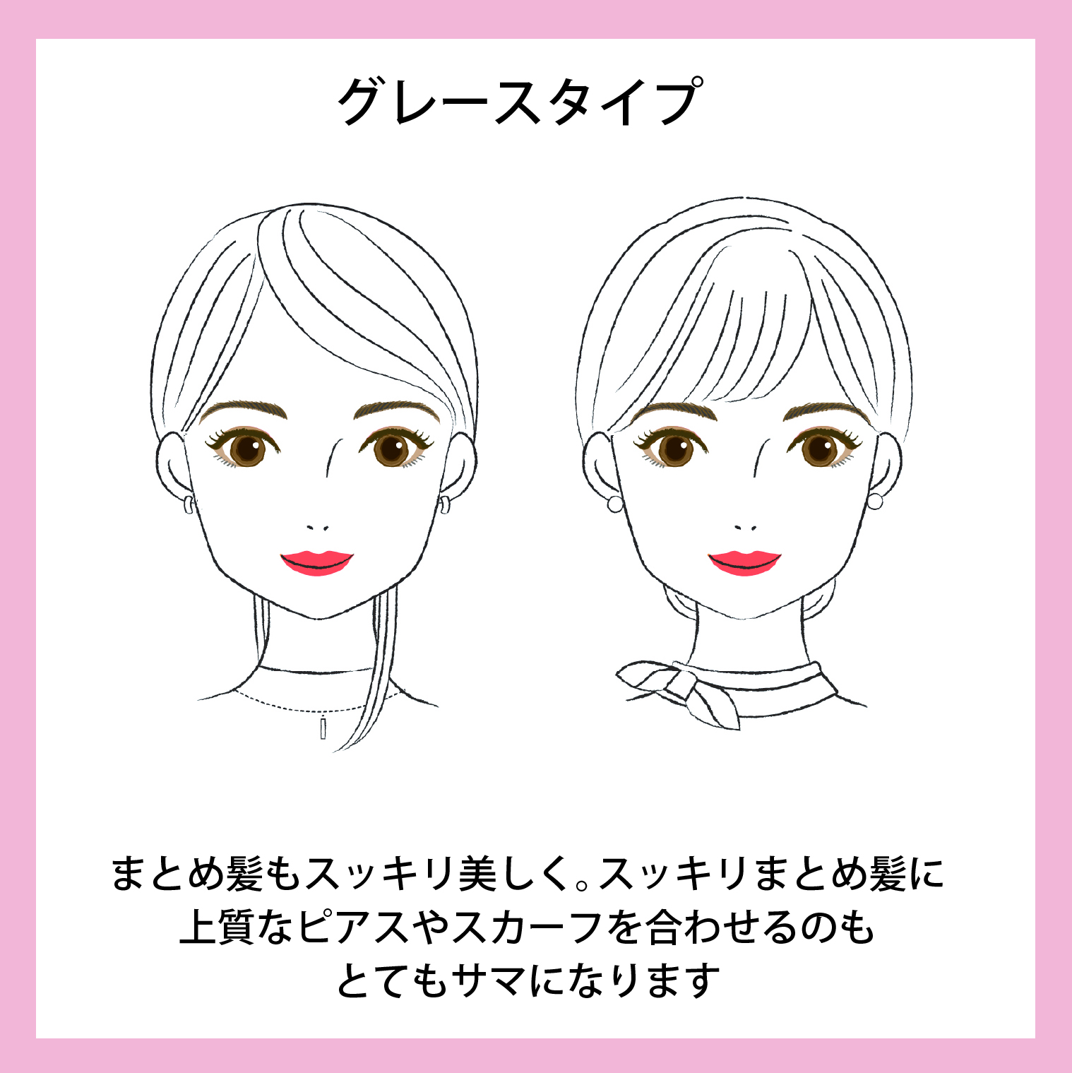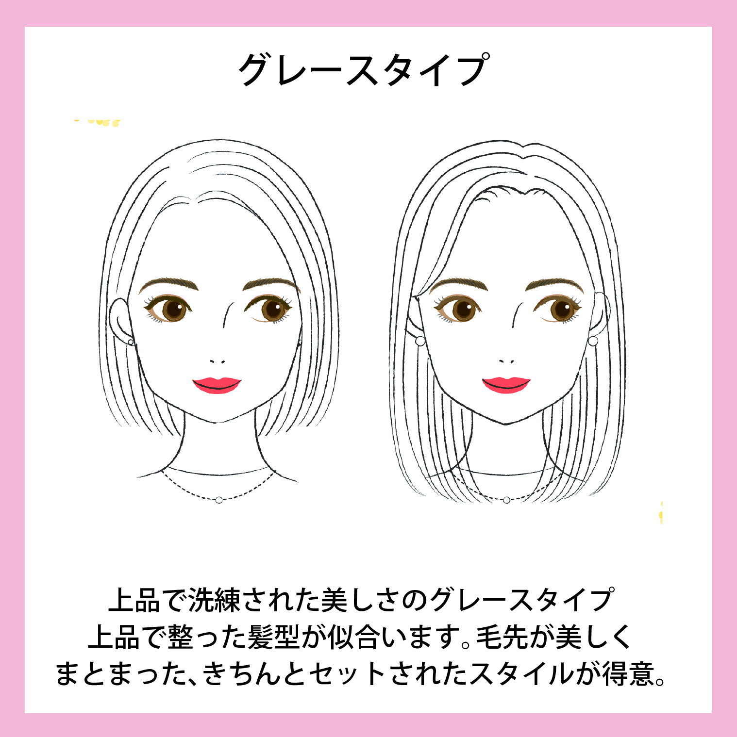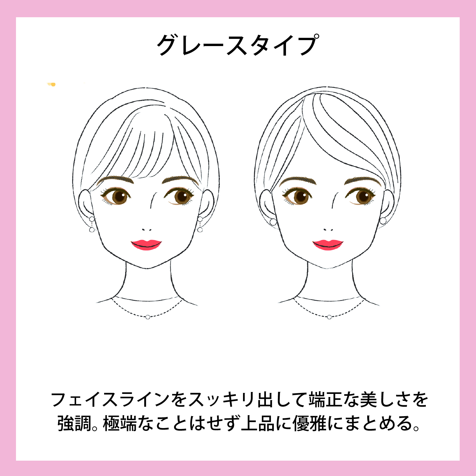 グレースタイプは上品できちっとセットされた髪型が得意です。無造作ヘアや毛先がピョンピョンしているものより、手入れされてしっとりまとまっていると美しいです。装飾が少ないのも得意なので、お顔をスッキリ出したショートやボブもきれいです。