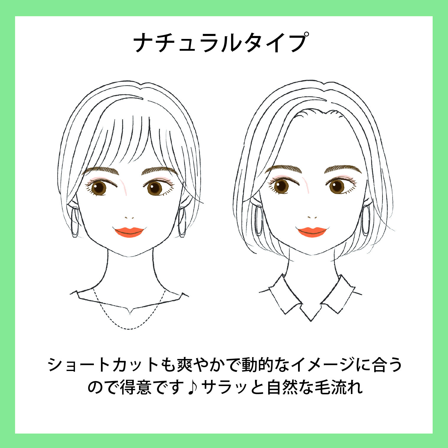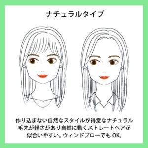 ナチュラルタイプは髪型も自然で気取らないものが得意です。きっちりまとまっているものより、毛先に軽さがあり自然なカールがあるものが映えます。動的なイメージも得意なのでショートカットもいいですね。